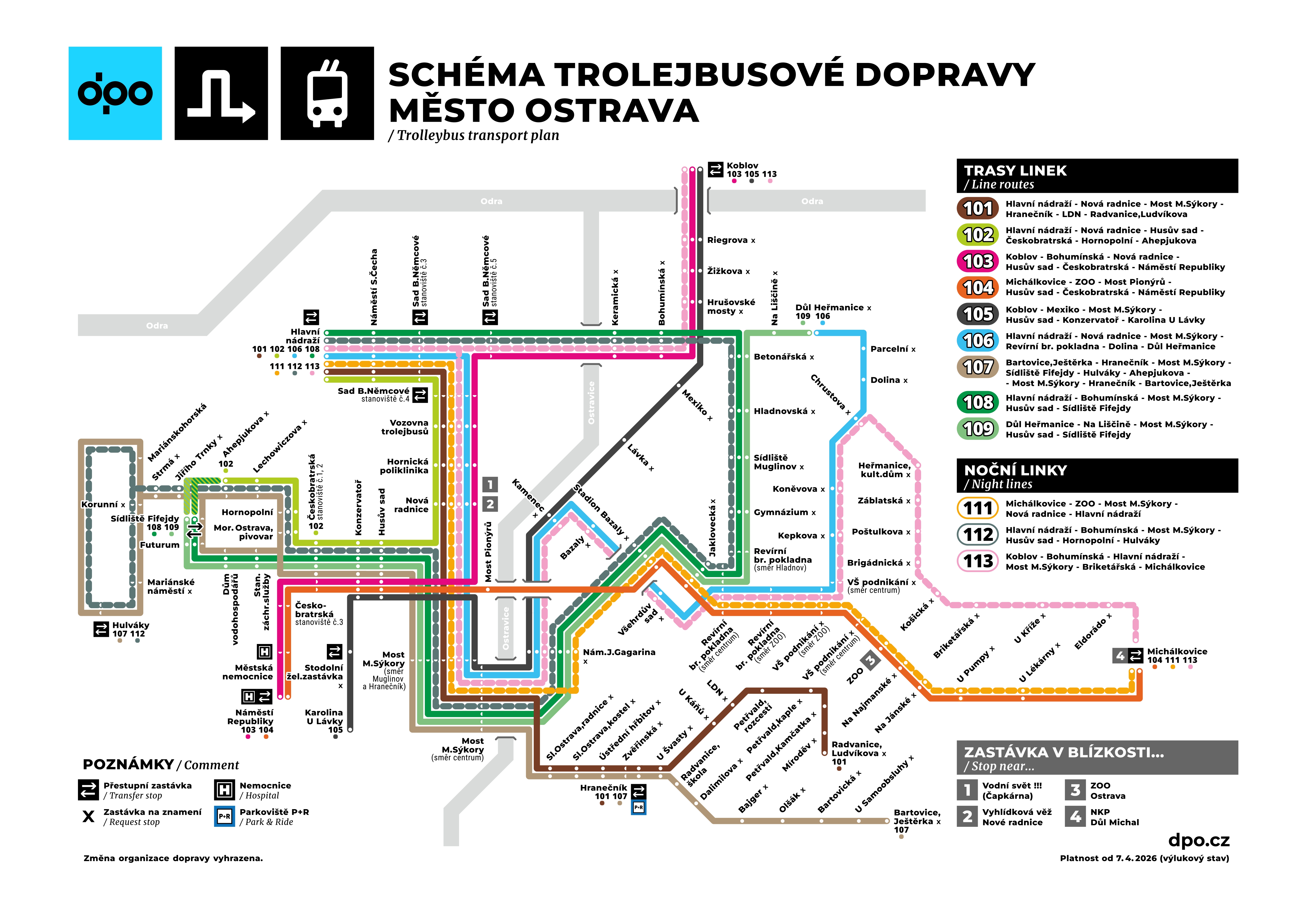 Od úterý 7. dubna 2026 (00:00 h) do pondělí 30. listopadu 2026 (24:00 h)*, z důvodu rekonstrukce ul. Novoveské a s ní spojené úplné uzávěry od křižovatky s ul. Grmelovou po křižovatku s ul. Sokola Tůmy, dojde ke změně organizace trolejbusových linek č. 102, 107, 108, 109 a 112, které budou v oblasti Fifejd a Mariánských Hor dočasně vedeny po upravených trasách. V souvislosti s těmito změnami budou upraveny jízdní řády všech trolejbusových linek.
